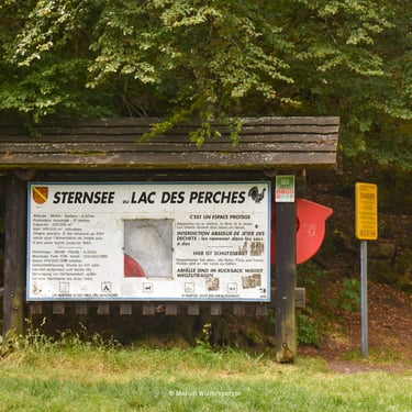 Plus loin sur ce sentier, prends à droite. Tu ressortiras rue du Belacker. Continue sur cette rue puis rue du Sternsee. Tu arriveras sur une intersection, prend à gauche en suivant le balisage "lac des Perches par Riesenwald" (triangle bleu). Le sentier va grimper jusqu'au lac !