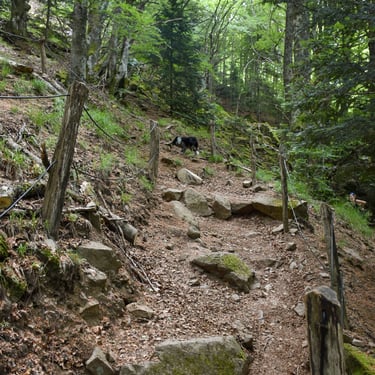 Puis retour dans la forêt et descente vers le lac du Neuweiher. Tu auras le droit à une descente en zigzag, prépare tes jambes, ça chauffe un peu.