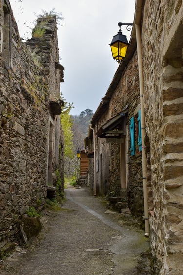Descends dans le village vers le panneau "Chemin des légendes". Suis le pour traverser le village entre les petites ruelles. Admire les maisons de pierre avec leurs volets de couleurs.
