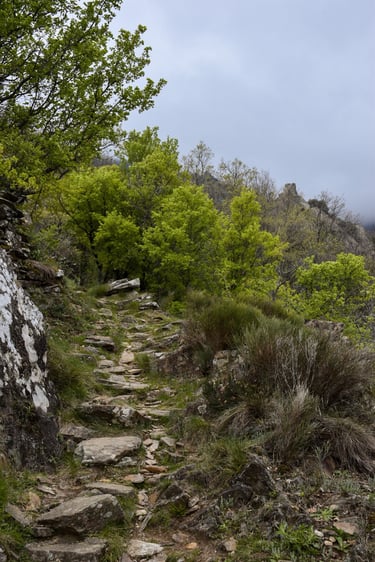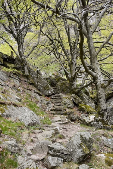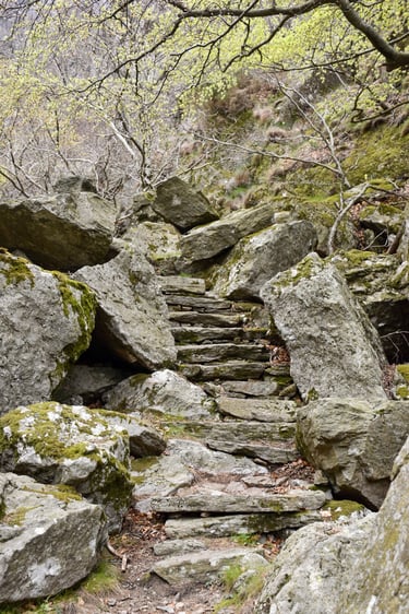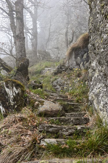J'ai fais ce chemin un jour nuageux et plus je montais plus je m'approchais du brouillard, j'arrivais tout doucement dans les nuages au fil des marches !