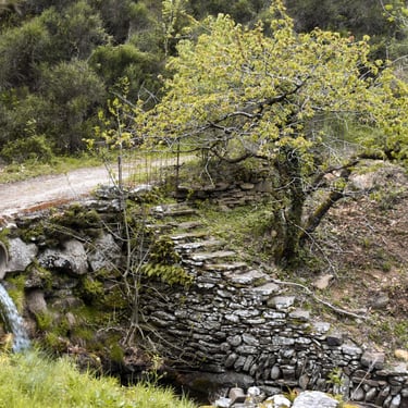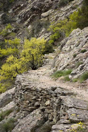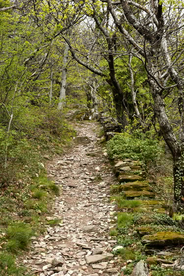 Continues ta descente dans cette forêt. Si tu regardes bien, tu pourras voir à certains endroits les vestiges de l'ancien chemin avec des renforts en pierres.