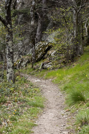Après le point de vue tu avanceras sur un chemin plus ou moins plat. Et un peu avant le début du quatrième kilomètre, tu commenceras à cheminer sur un sentier assez spécial, si tu observes bien il est soutenu par des pierres !