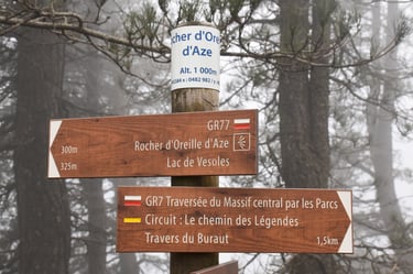Tu arriveras devant un panneau qui indique la direction du GR et la direction du chemin des légendes, suis les indications et emprunte le chemin qui se dessine sur ta droite. Ce panneau est au Rocher d'Oreille D'aze qui se trouve sur ta gauche.