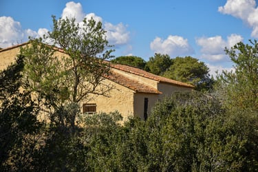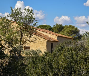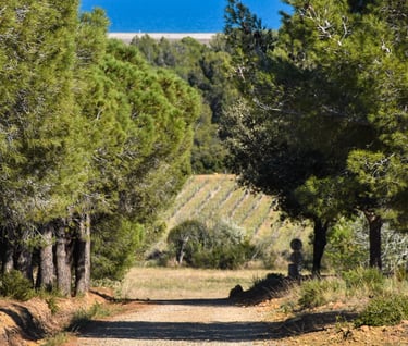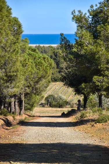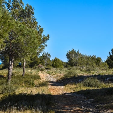 Le départ se fait depuis la ferme, prend le sentier sur ta gauche et tu verras un peu plus loin, sur ta droite des vignes et sur ta gauche des pins.