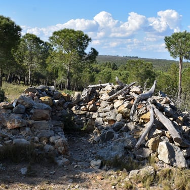 Ce chemin te fera passer dans une pineraie et tu chemineras sur un sentier de crête. Tu suivras alors un chemin en terre rouge bordé d'abris de chasseurs en pierres sèches empilées.